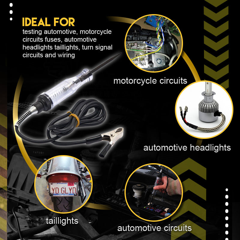 - Utrustning som används i stor utsträckning för att testa kretsar i spänningsintervallet 3–24V. Idealisk för att testa kretsar, säkringar, fyrljus, bakljus, blinkerskretsar och ledningar i bilar och motorcyklar.