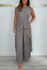 Set med plisserad kortärmad oregelbunden miditopp och byxor med vida ben och elastisk midja